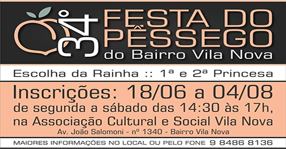 Ainda faltam mais de três meses para o início da tradicional Festa do Pêssego da Vila Nova, mas já estão abertas as inscrições para a escolha da rainha e das princesas de evento. As jovens que desejarem participar têm até 4 de agosto para se inscreverem, de segunda a sábado, das 14h30 às 17h, na […]