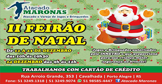 Do dia 12 a 23 de dezembro, o Atacado Maronas estará realizando o seu 2° Feirão de Natal, com a venda de jogos e brinquedos e materiais esportivos com preço de Atacado, todos autorizados pelo Inmetro, o que proporciona mais segurança para os pais e responsáveis de que suas crianças estão brincando com produtos certificados […]
