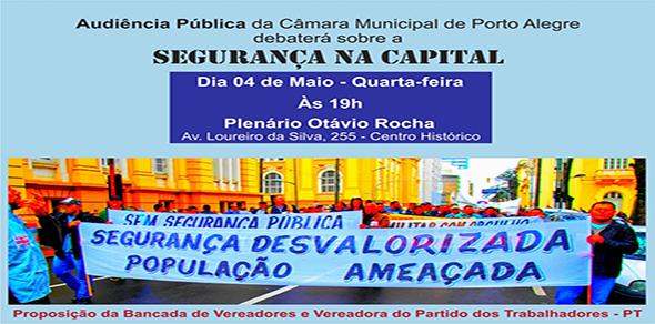 Nesta quarta-feira (4 de maio), a partir das 19h, será realizada audiência pública sobre o tema Segurança na Capital. O encontro, proposto pela bancada do PT na Câmara Municipal, no Plenário Otávio Rocha da Casa Legislativa (Av. Loureiro da Silva, 255 – Centro Histórico).