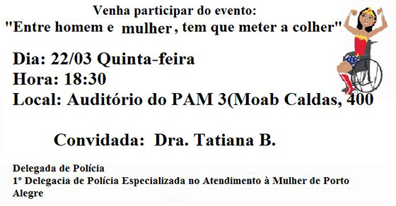 Discutir quais as formas e estratégias para “meter a colher” em relações conflituosas é um dos objetivos da palestra “Entre homem e mulher, tem que meter a colher”, que será realizada 22 de março (quinta-feira), às 18h30, no auditório do PAM3, na Rua Mohab Caldas, 400. Para debater a concepção arcaica “em briga de marido […]