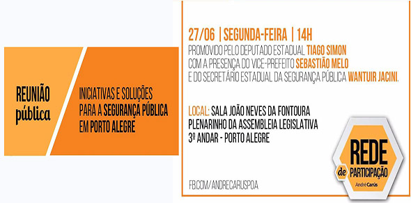 Nesta segunda-feira (27 de junho), às 14h, uma reunião pública, promovida pelo deputado estadual Tiago Simon, debaterá “Iniciativas e Soluções para a Segurança Pública em Porto Alegre”. O evento é aberto ao público e será realizado na Sala João Neves da Fontoura, na Assembleia Legislativa, com a participação do vice-prefeito de Porto Alegre, Sebastião Melo, […]