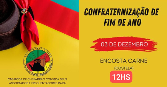Neste domingo (3 dezembro), a partir das 12h, o CTG Roda de Chimarrão abre as portas de seu galpão crioulo para a realização de um encosta carne para confraternizar o final de mais um ano de atividades do centro de tradições gaúchas com associados e amigos da comunidade. Para participar do evento, é só levar […]
