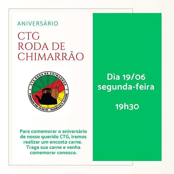 Nesta segunda-feira (19 de junho), a partir das 19h30, o CTG Roda de Chimarrão abre as portas de seu galpão crioulo, na Avenida da Serraria, 1835, para comemorar os 38 anos de sua fundação junto com a comunidade. A festa de aniversário do centro de tradições gaúchas da Zona Sul de Porto Alegre fundado em […]