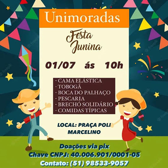 Muitas brincadeiras para as crianças e comidas típica estão na programação A associação Unidos da Moradas da Hípica (Unimoradas) promove neste sábado (1º de julho), a partir das 10h, a tradicional festa junina da entidade, na Praça Poli Marcelino Espírito, no loteamento Moradas da Hípica, bairro Hípica, na Zona Sul de Porto Alegre. Entre as […]