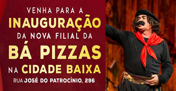 Comediante apresentará seu pocket show nesta quarta-feira (30/01) na Rua José do Patrocínio, 296, na Cidade Baixa, na área central de Porto Alegre A Bá Pizza está inaugurando uma nova filial, na Rua José do Patrocínio, 296, no bairro Cidade Baixa, na área central de Porto Alegre. A abertura ao público acontecerá nesta terça-feira, […]
