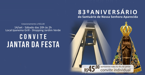 Carnes, frutos do mar e massas estão no cardápio do jantar da festa de 83° aniversário do Santuário de Nossa Senhora Aparecida, sediado no bairro Ipanema, na Zona Sul de Porto Alegre. O evento será realizado neste sábado (14 de setembro), a partir das 20h, no Ipanema Grill, no Shopping Jardim Verde, com ingressos a […]