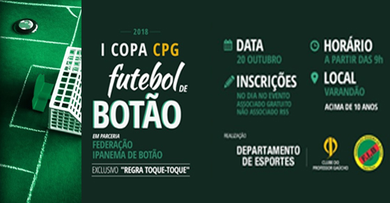 Competição será realizada em parceria com a Federação Ipanema de Botão, que já organiza torneios do tipo há anos O CPG (Clube do Professor Gaúcho), em parceria com a FIB (Federação Ipanema de Botão), está realizando a sua primeira competição de Futebol de Botão (na regra “toque-toque”), no dia 20 de outubro (sábado). Poderão […]