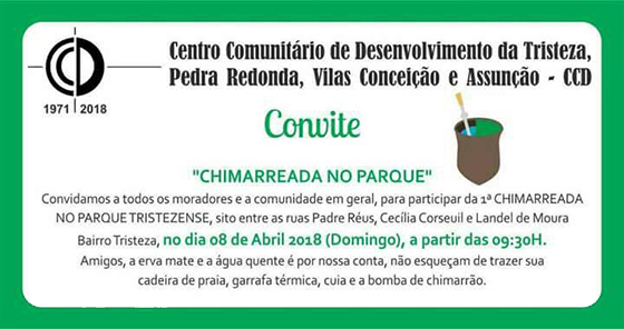 No dia 8 de abril (domingo), a partir das 9h30, a população está convidada a participar da 1ª Chimarreada no Parque Tristezense, no bairro Tristeza, na Zona Sul de Porto Alegre. É necessário levar apenas a garrafa térmica e a cuia e a bomba de chimarrão, pois a erva-mate e a água quente são oferecidas […]