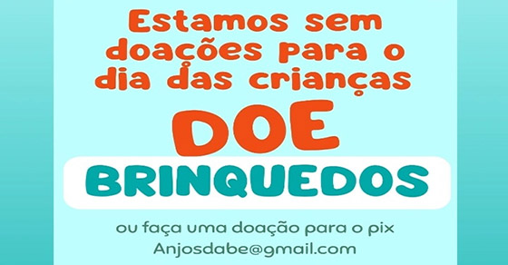 Último dia da arrecadação de brinquedos para as crianças atendidas pelo projetos Anjos da Be. Colabore você também, doando brinquedos que os voluntários podem buscar em seu endereço, ou fazendo um Pix, com qualquer valor, para anjosdabe@gmail.com . Mais informações pelo telefone/WhatsApp (51) 98484-0156.