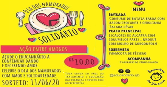 Para angariar fundos, o Educandário São João Batista, entidade filantrópica para tratamento e educação de crianças e jovens com deficiências, está promovendo uma ação entre amigos que irá sortear um Jantar Delivery Beneficente de Dia dos Namorados. Com o apoio de um Chef de Cozinha Voluntário, Joel da Silva, que vai preparar o jantar, a […]