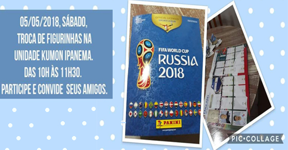 Neste sábado (5 de maio), das 10h às 11h30, a unidade Kumon Ipamema abre seu espaço para uma atividade diferente: trocas de figurinhas do álbum da Copa do Mundo, produzido pela Panini. Além de contar com a participação de alunos de Inglês, Português e Matemática da unidade, a atividade está aberta à comunidade. O Kumon […]