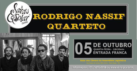 Realizado desde 1993 pela Assembleia Legislativa do Rio Grande do Sul, o Sarau do Solar é um projeto que promove espetáculos musicais com entrada franca e temporadas anuais que vão de março a dezembro. Em outubro, a atração do Sarau do Solar será Rodrigo Nassif Quarteto, grupo de música instrumental que se apresenta no dia […]