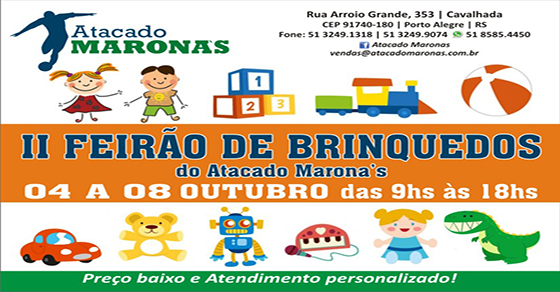O Atacado Maronas está promovendo, desde o dia 04 de outubro, segunda-feira, o seu 2º Feirão de Brinquedos, com produtos e preços de atacado diretamente para o consumidor. O Feirão permanecerá em funcionamento até sábado, dia 08 de outubro, das 9h às 18h, no Atacado Maronas, localizado na Rua Arroio Grande, 353, no bairro Cavalhada. Para mais […]