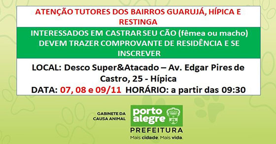 Credenciamento dos animais será realizado nos dias 7, 8 e 9 de novembro (segunda a quarta-feira), das 9h30 às 15h30, no Desco Super&Atacado Nos dias 7, 8 e 9 de novembro, das 9h30 às 15h30, os moradores de três bairros da Zona Sul de Porto Alegre (Guarujá, Hípica e Restinga) poderão inscrever seus cães para […]