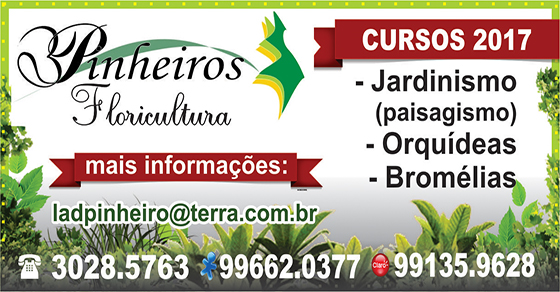 Jardinismo (Paisagismo), Orquídeas e Bromélias já estão com inscrições abertas Jardinismo (Paisagismo), Orquídeas e Bromélias são os tradicionais cursos da Floricultura 3 Pinheiros com as primeiras turmas de 2017. Os preços e demais informações podem se solicitados pelo e-mail ladpinheiro@terra.com.br ou pelos telefones (51) 3028-5763, 99662-0377 (Vivo) e 99135-9628 (Claro). A Floricultura 3 Pinheiros, sediada na Rua Ladislau […]
