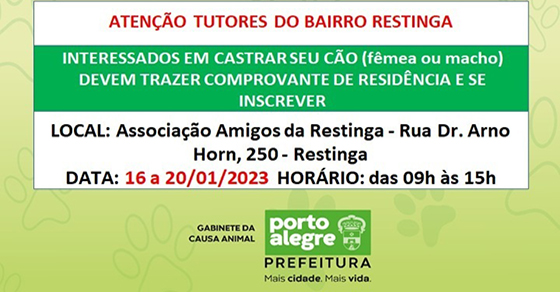 Credenciamento dos animais será realizado de 16 a 20 de janeiro (segunda a sexta-feira), na Associação Amigos da Restinga De 16 a 20 de janeiro, os moradores de alguns bairros da Zona Sul de Porto Alegre poderão inscrever seus cães para fazer a castração, de forma gratuita, a ser realizada pela Prefeitura. De segunda a […]