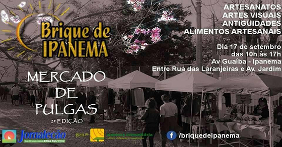 Se não chover neste final de semana, a segunda edição do mês do Brique de Ipanema será realizada neste domingo (24 de setembro), das 10h às 17h, na Avenida Guaíba, no trecho entre Rua das Laranjeiras e a Avenida Jardim. No local, dezenas de participantes expõem produtos de Artesanato, Antiguidades, Alimentos Artesanais e Artes Visuais. Mais informações em www.facebook.com/briquedeipanema