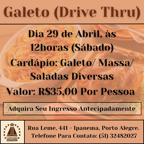 Rainha e Padroeira do Brasil tem Santuário em Porto Alegre No dia 29 de abril, sábado, às 12h o Santuário Nossa Senhora Aparecida, Rua Leme, 441, Ipanema em Porto Alegre, na zona sul promove um galeto com massa e saladas diversas para angariar fundos. O Santuário foi originado em 1935 por Déa Coufal, quando a […]
