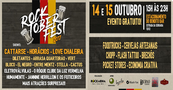 A produtora Rockarina, em parceria com o BenditoBar (do Roger Viana), promove, nos dias 14 e 15 de outubro (sábado e domingo), das 15h às 23h, a 1ª Rocktoberfest, evento gratuito que contará com diversas atrações, artes, cultura germânica, comida típica alemãs, cervejas artesanais, pocket stores, brechós, foodtrucks, shows, flash tattoo, atrações surpresas e espaço […]
