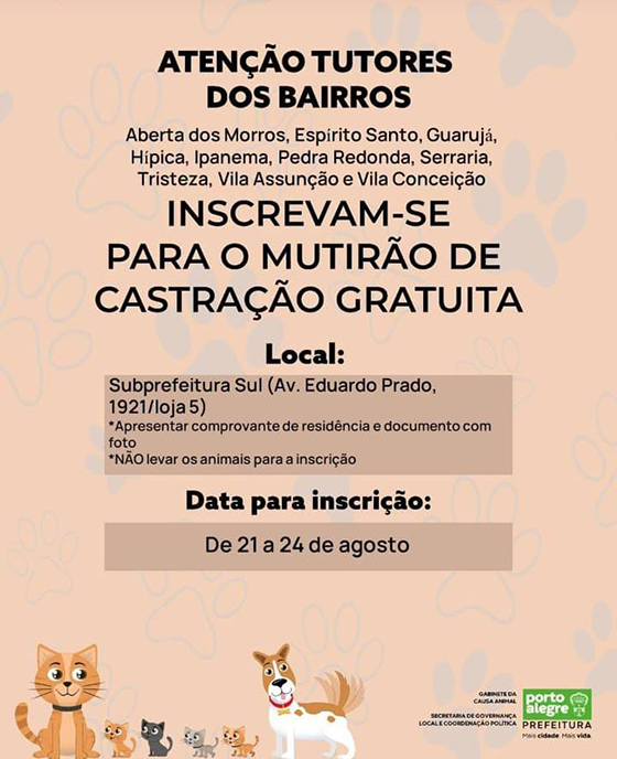 O Gabinete da Causa Animal abre inscrições nesta segunda-feira, 21, até a quinta-feira, 24, para um mutirão de castração gratuita de animais na Zona Sul da cidade. O mutirão ocorrerá nos bairros Aberta dos Morros, Espírito Santo, Guarujá, Hípica, Ipanema, Pedra Redonda, Serraria, Tristeza, Vila Assunção e Vila Conceição. As inscrições devem ser feitas na subprefeitura Sul, localizada […]