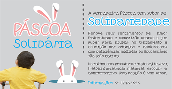Com o mote “não é só com chocolates que se adoça a vida das crianças”, campanha arrecada donativos materiais e financeiros O Educandário São João Batista, localizado no bairro Ipanema, em Porto Alegre, entidade filantrópica destinada a tratamento e educação de crianças e adolescentes com deficiências múltiplas, está promovendo a campanha Páscoa Solidária, que […]