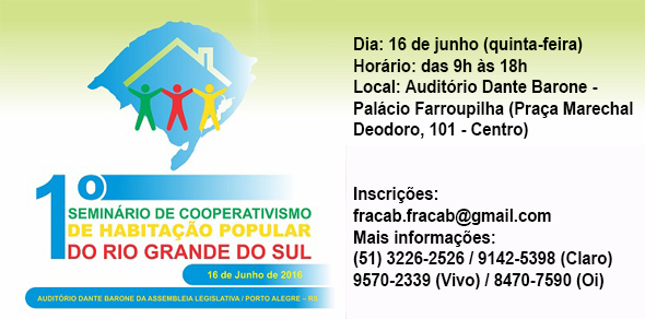 Nesta quinta-feira (16 de junho), das 9h às 18h, a Assembleia Legislativa sedia o Seminário de Cooperativismo da Habitação Popular. O evento, que será realizado no Auditório Dante Barone, ainda está com inscrições abertas ao público interessado no assunto, especialmente integrantes de cooperativas habitacionais, que poderão inscrever até três representantes cada, doando 2 quilos de […]