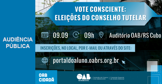 Audiência pública que pretende orientar eleitores está marcada para esta segunda-feira (9 de setembro), a partir das 9h A OAB/RS está lançando, em 9 de setembro, a campanha Vote Consciente – Conselho Tutelar, simultaneamente à realização de audiência pública que objetiva esclarecer os eleitores sobre as eleições de renovação do Conselho Tutelar, que não têm […]