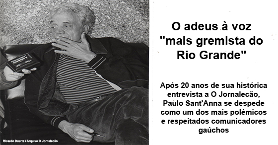 Após 20 anos de sua histórica entrevista a O Jornalecão, Paulo Sant’Ana se despede como um dos mais polêmicos e respeitados comunicadores gaúchos Poucas semanas antes de sua histórica entrevista a O Jornalecão completar 20 anos, o comunicador Paulo Sant’Ana dá seu adeus, deixando uma marca no jornalismo gaúcho, após décadas de exposição de […]