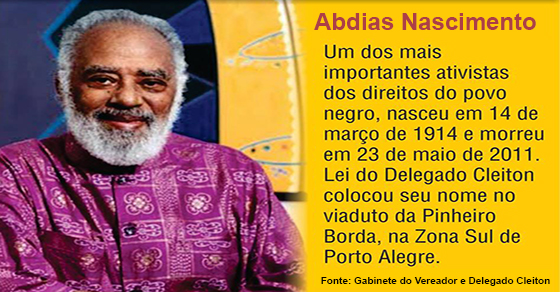 Foram quatro anos de espera até a inclusão do nome de Abdias do Nascimento no equipamento público que liga a Zona Sul ao Centro de Porto Alegre Quase quatro anos após sua inauguração, o Viaduto Abdias do Nascimento, finalmente, recebeu uma placa para homenagear o ativista dos direitos humanos que empresta seu nome ao […]