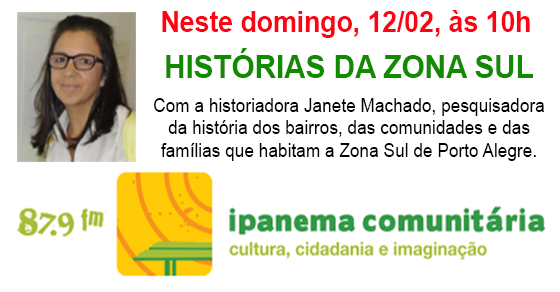 Neste domingo (12 de fevereiro), a partir das 10h, a Rádio Ipanema Comunitária realiza o programa Histórias da Zona Sul, com a historiadora Janete Machado, que é formada em História e Turismo, moradora de Ipanema e está concluindo seu Doutorado em História, na PUCRS. Janete se dedica, desde 2008, a pesquisar e escrever sobre a história […]